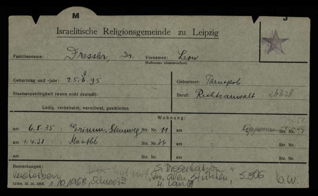Im Zuge der sogenannten Reichspogromnacht wurde jedoch auch Leon Dressler aufgrund seiner Religion Opfer der nationalsozialistischen Diktatur und wurde am 10.11.1938 in das Konzentrationslager Buchenwald deportiert. Mit dem Begriff Reichspogromnacht oder auch „Reichskristallnacht“ wird die Nacht vom 9. auf den 10. November 1938 bezeichnet, als organisierte Schlägertrupps der Nationalsozialisten in vielen deutschen Städten Synagogen anzündeten, jüdische Geschäfte plünderten, Juden verprügelten und töteten. Mit dem Pogrom und der anschließenden Verhaftungswelle erreichte die antisemitische Politik des NS-Regimes eine weitere Eskalationsstufe, die am Ende in den Völkermord an den europäischen Juden führte. Das Geschäft seines Bruders Karl Dressler wurde in der gleichen Nacht zerstört. Karl Dressler wurde nach Auschwitz deportiert und dort ermordet. Leon Dressler wurde am 19.10.1938 die Zulassung zur Rechtsanwaltschaft entzogen. So wurde ihm seine Lebensgrundlage genommen. Nach seiner Entlassung aus dem KZ Buchenwald flüchtete Leon Dressler im Dezember 1938 über Frankreich in die Schweiz. Dort arbeitete er in der Uhrenbranche. Im Frühjahr 1941 floh er weiter nach Kuba, wo er 1946 die kubanische Staatsbürgerschaft erhielt. Nachdem er ab 1947 in New York lebte, ging er Ende 1956 wieder zurück in die Schweiz. Dort starb er am 01.10.1968 in Genf.